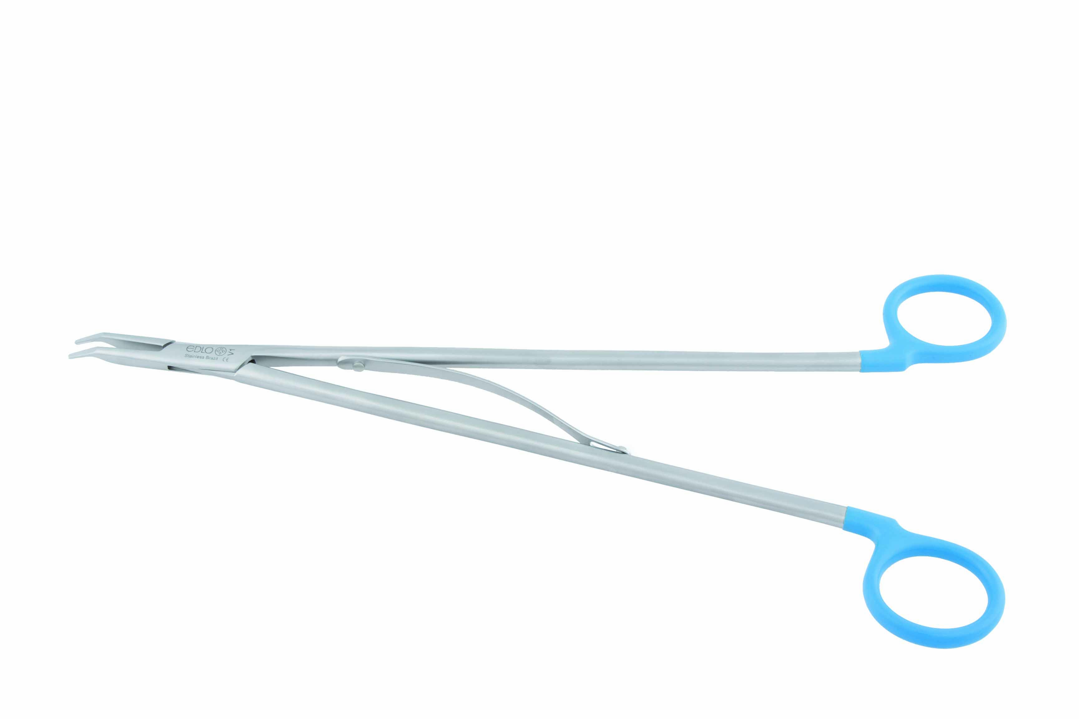 Porta-agulhas curvo p/obesidade, com vídea, longitudinal, 5,0mm x 42cm de comprimento, autoclavável, em aço inoxidável. Empunhadura 141122